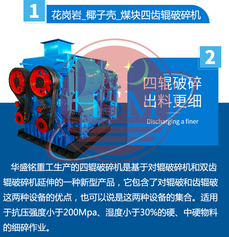 四辊破碎机物料进入上面两辊V型破碎腔以后,受到上两辊相对旋转的挤压力作用,将物料挤轧和啮磨后再进入相对旋转的中间两辊,利用中间两辊的挤压力进行二次挤轧和细破后,然后进入下两辊破碎成需要的粒度由输送设备送出。